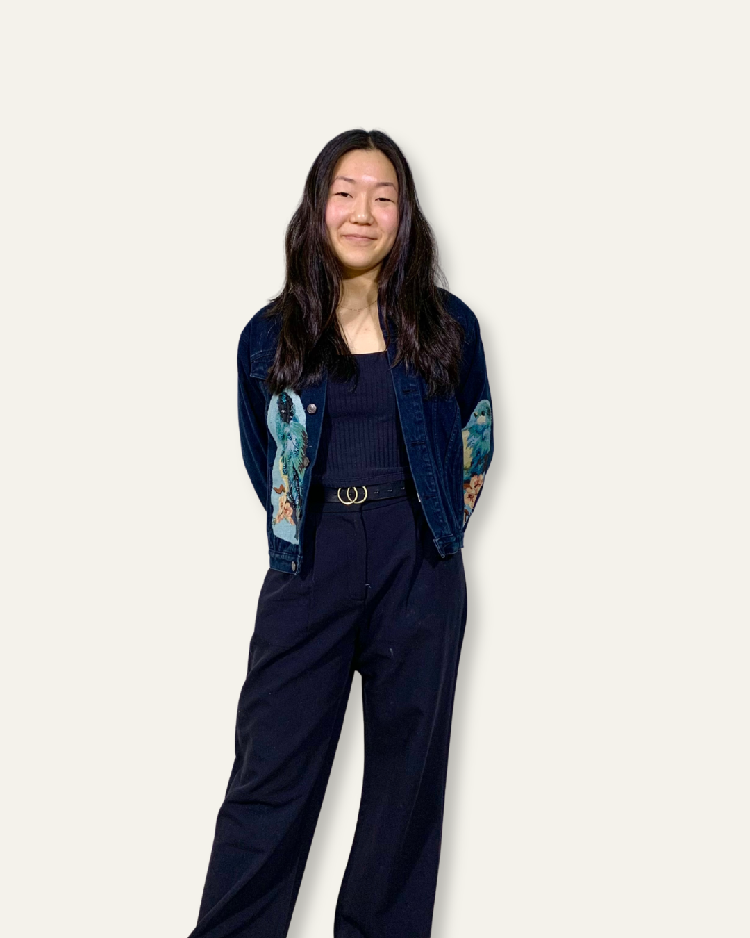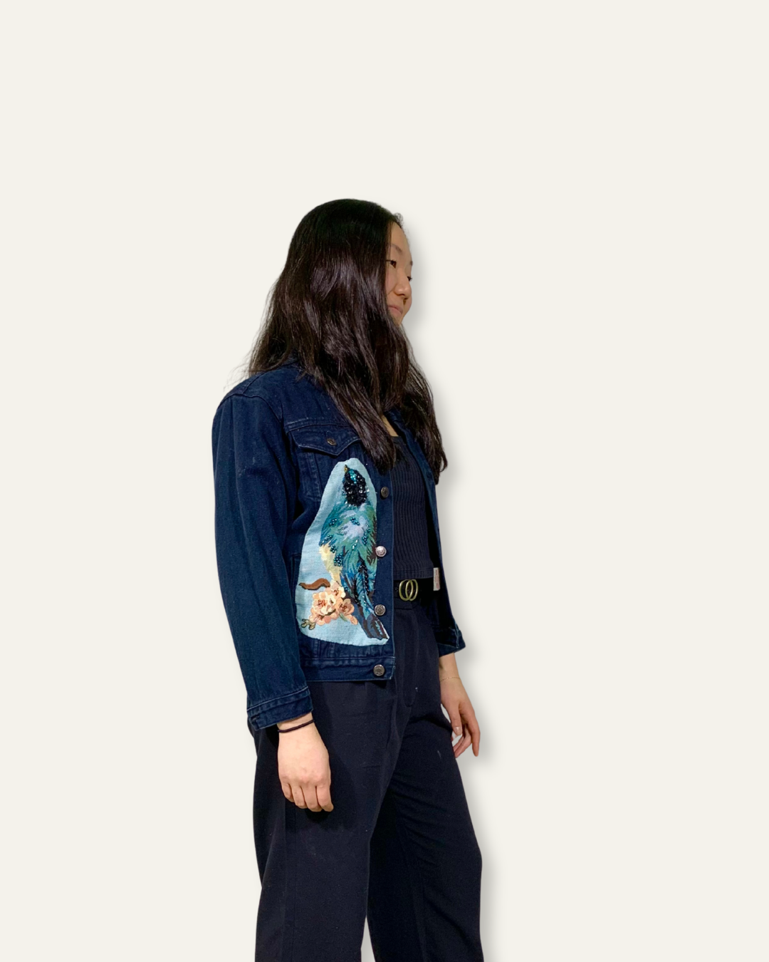 Upcycled Black Denim Jacket with Embellishments and Bird Cutouts in size xs, handmade at our Doubletake Upcycling Studio.