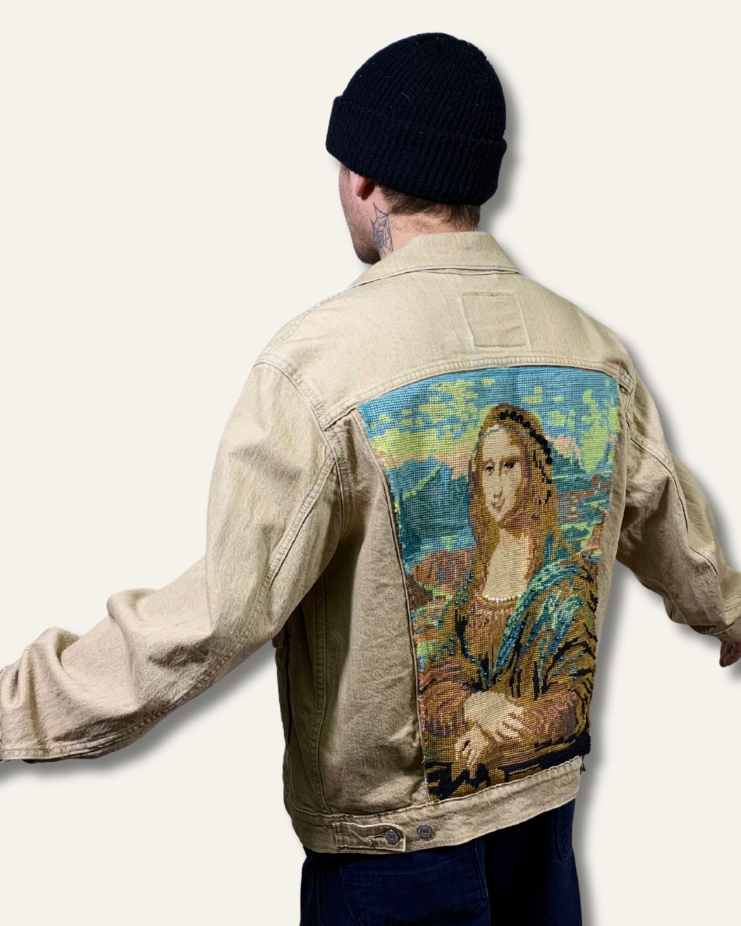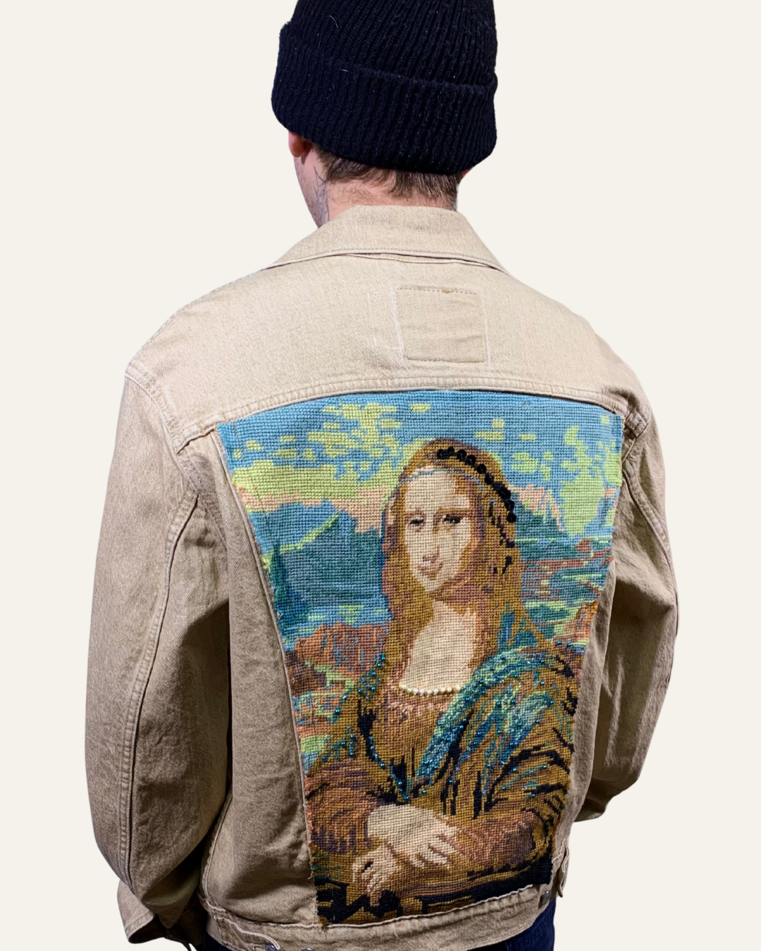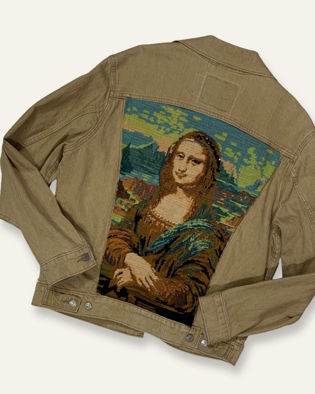 Upcycled Mona Lisa and Turquiose Applique Denim Jacket handmade in our Doubletake Upcycling Studio.