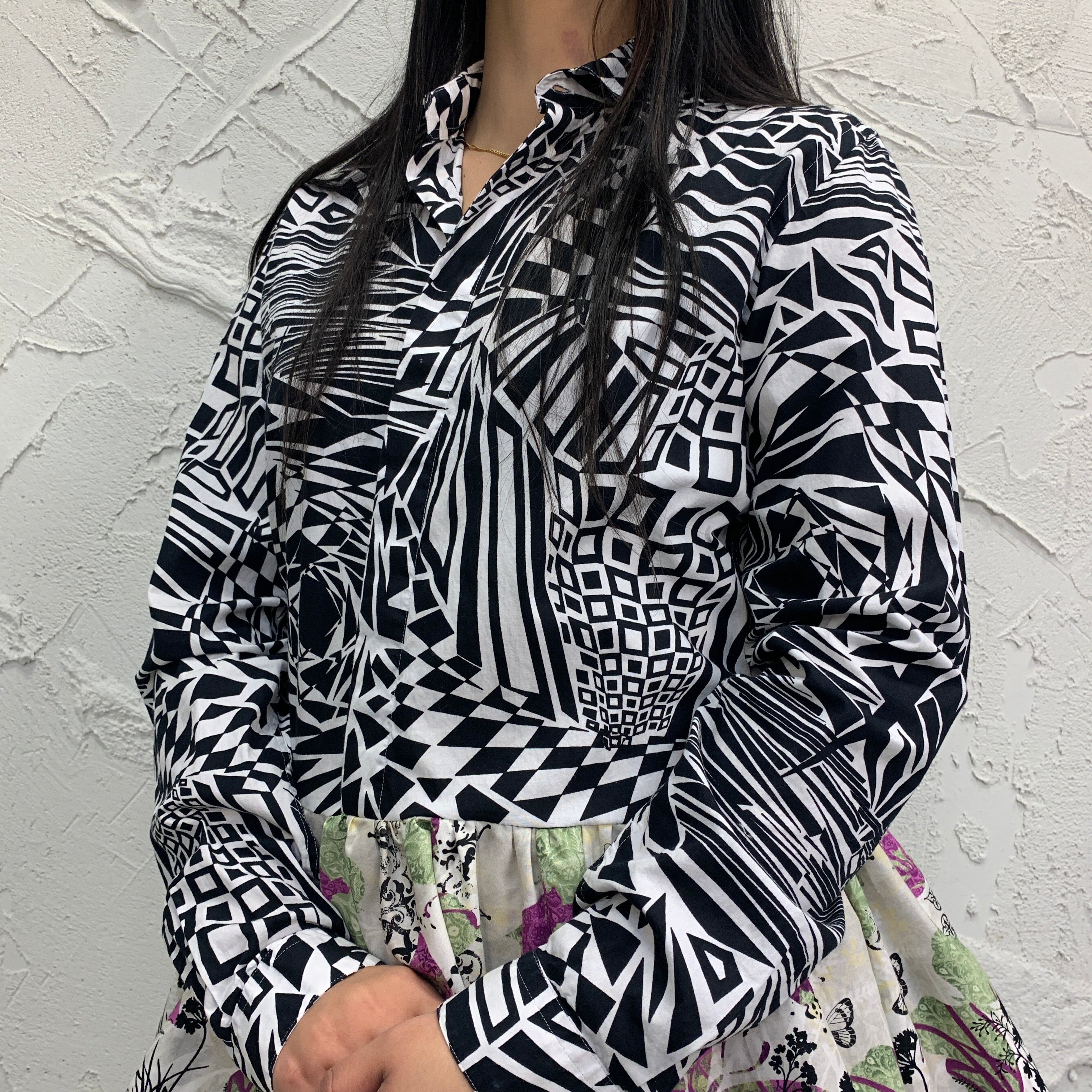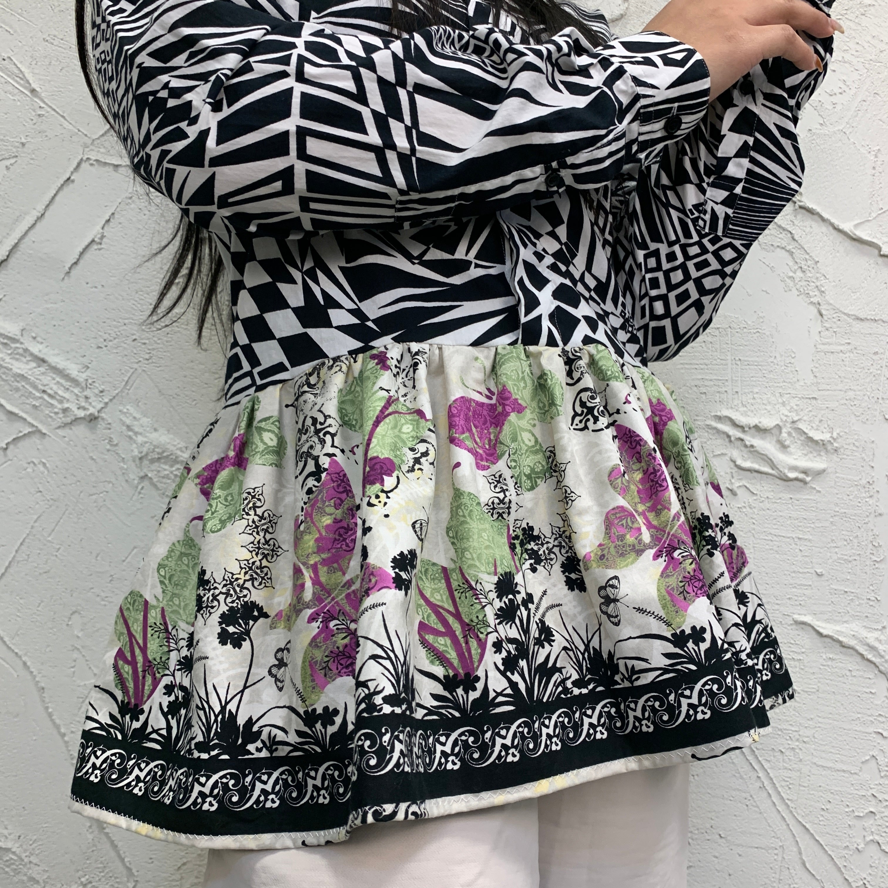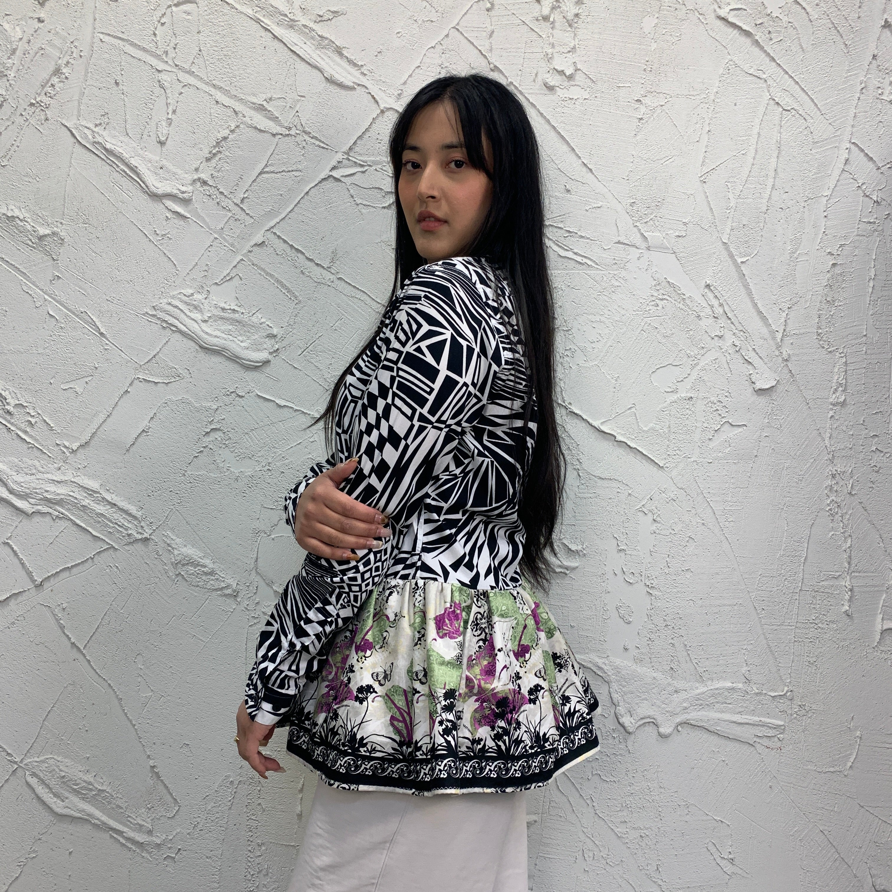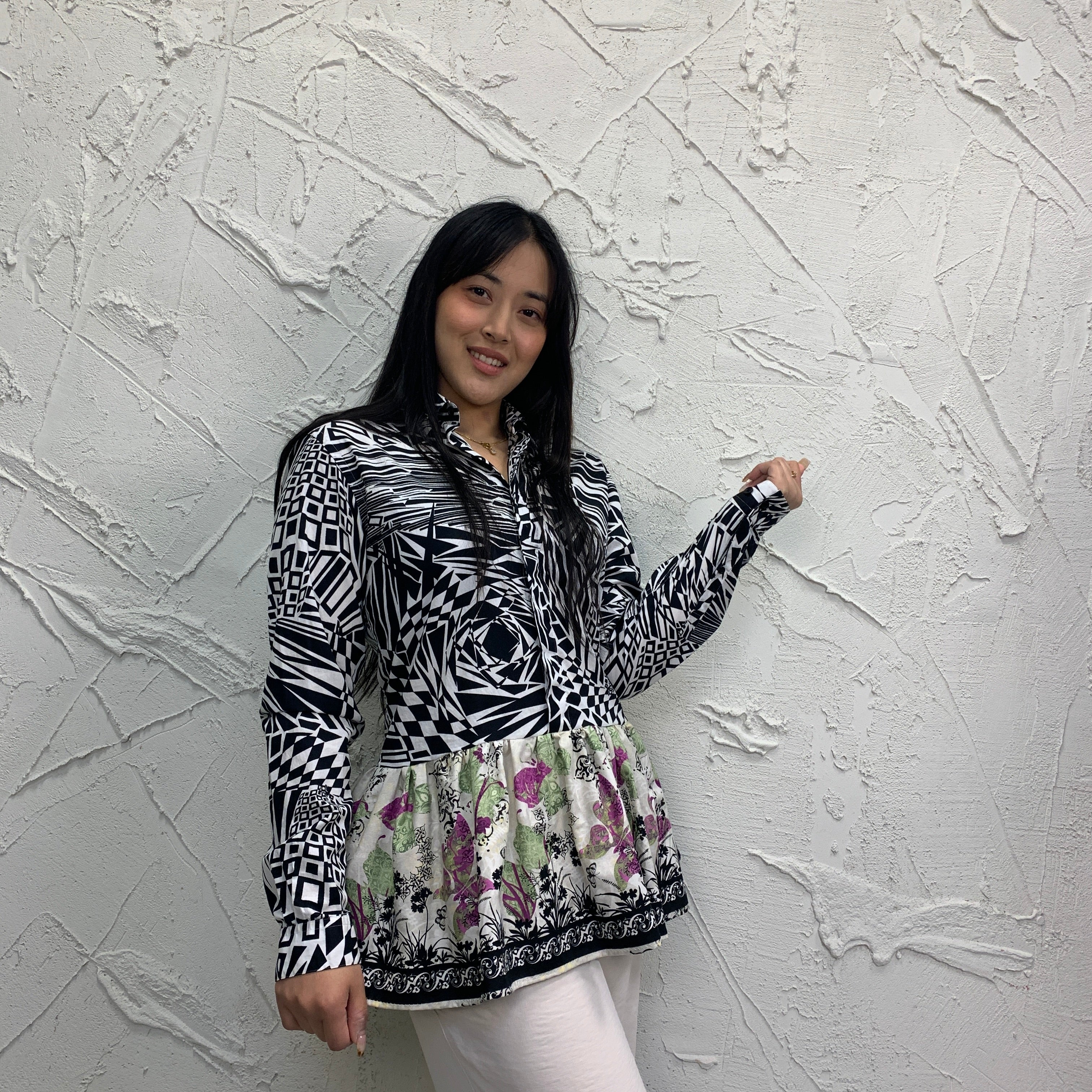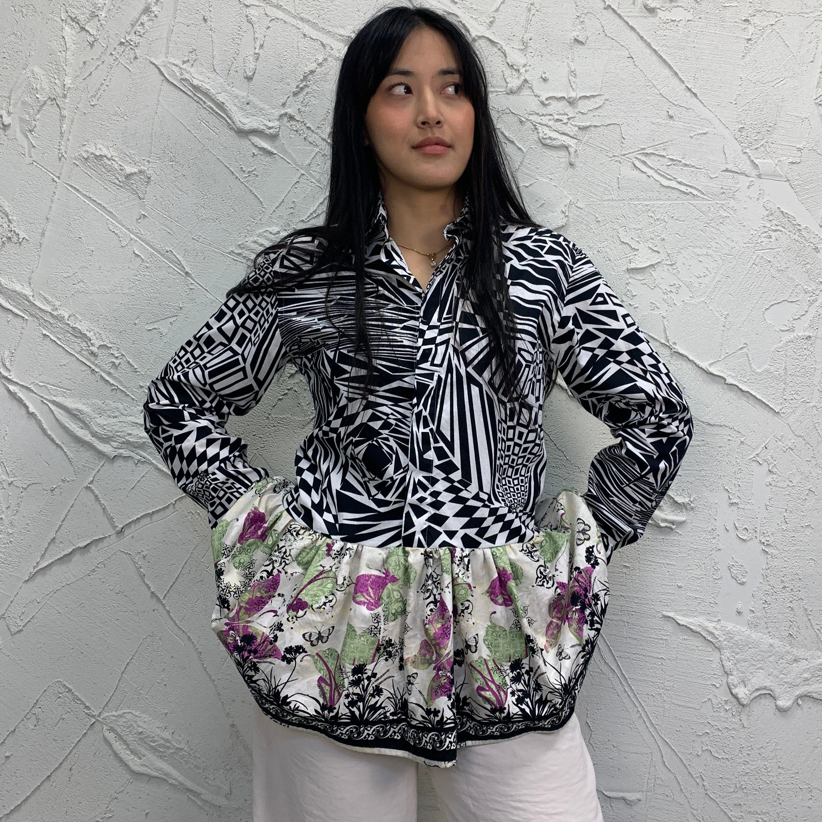 Upcycled Black and White Graphic Print with Floral Print Ruffle Shirtdress