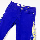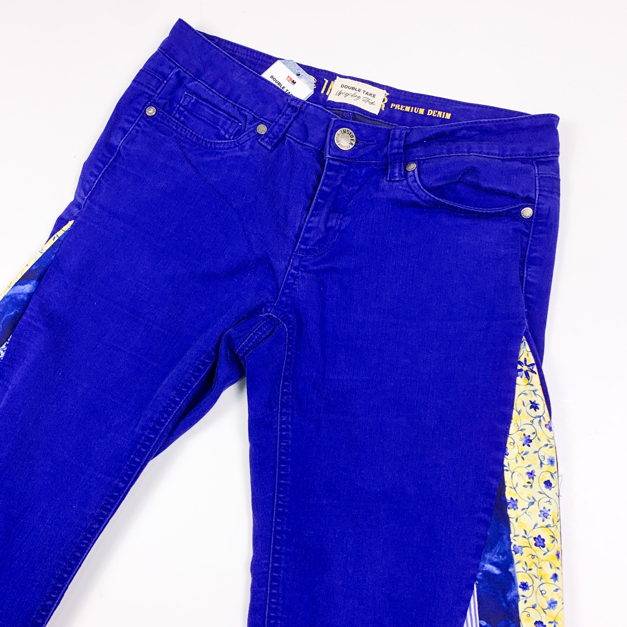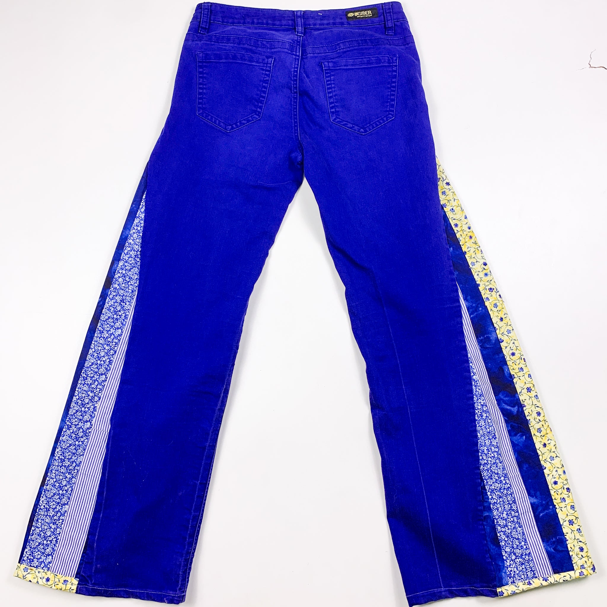 - Blue flared pants with multicolor patchwork panels for a wider, more trendy look!