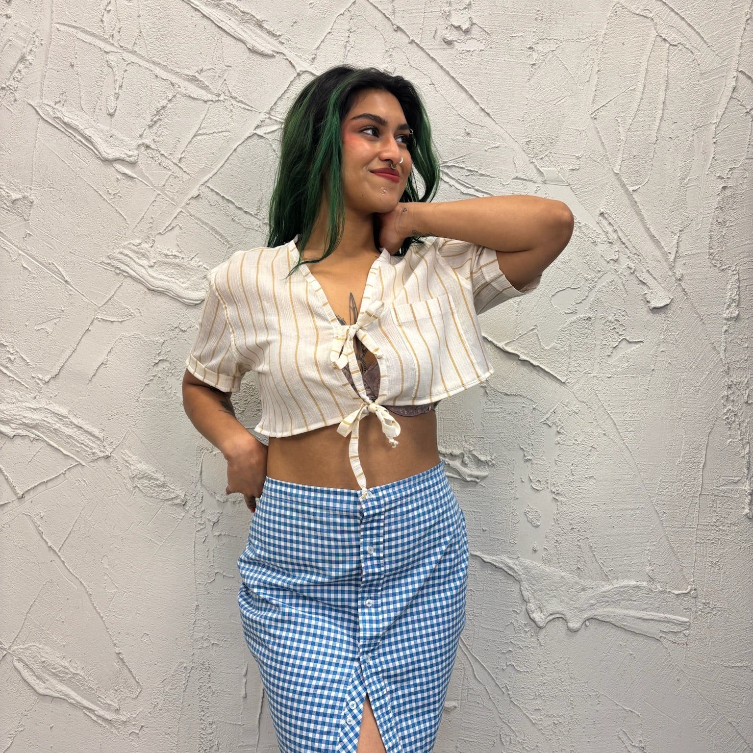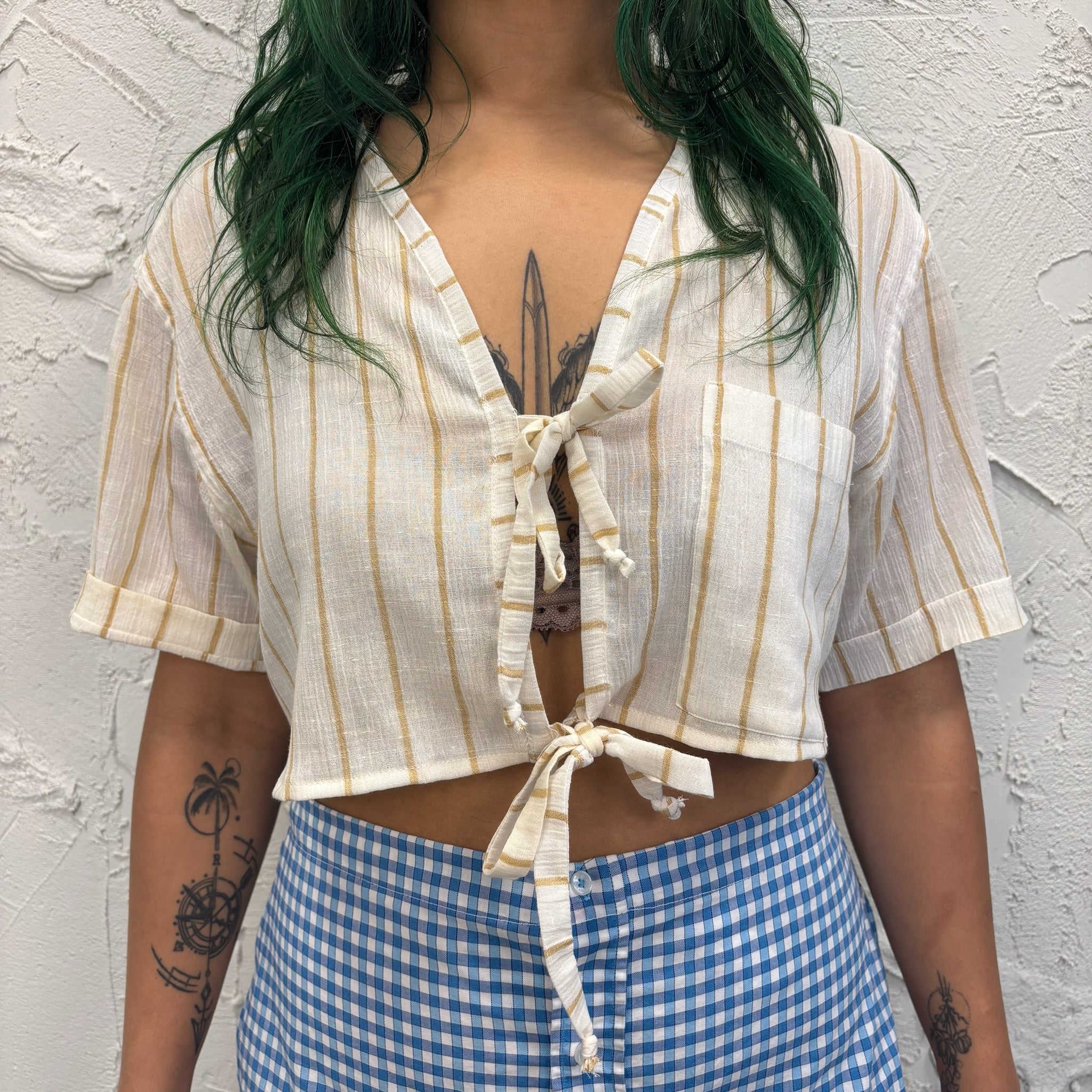 Upcycled Ivory and Tan Stripe Tie Front Shirt