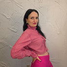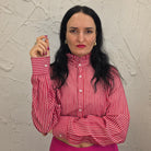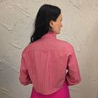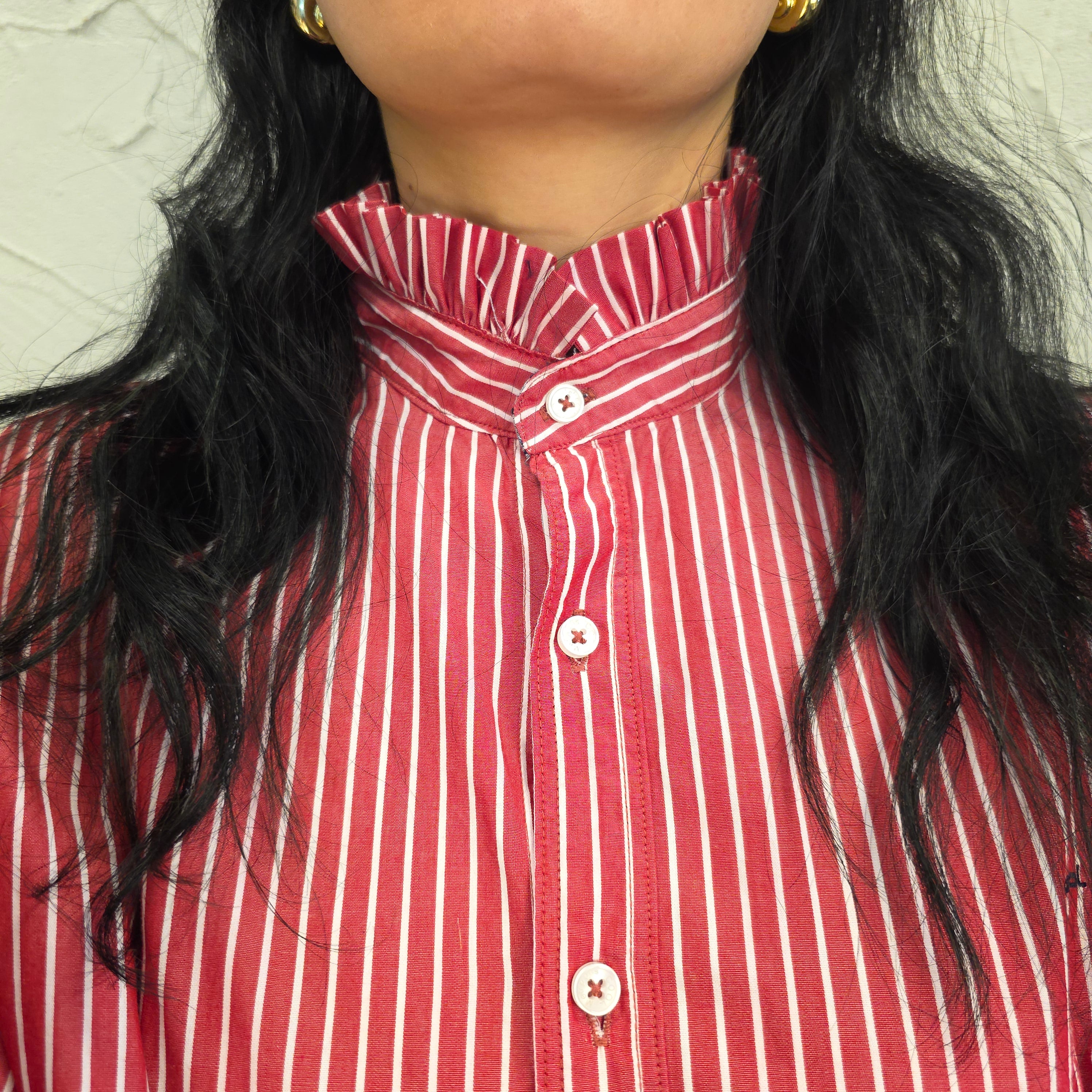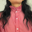 • A ruffle at the neck makes this cropped red and white striped shirt pop with playful, sustainable charm.