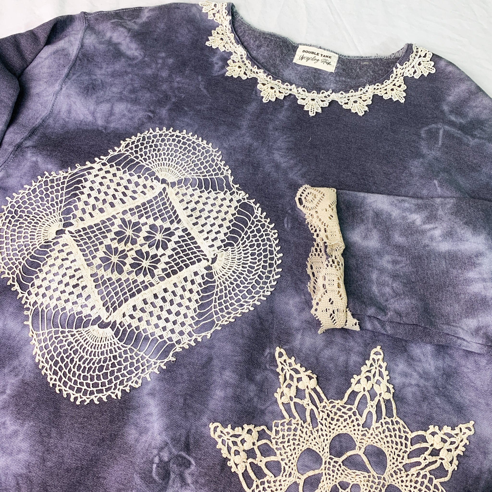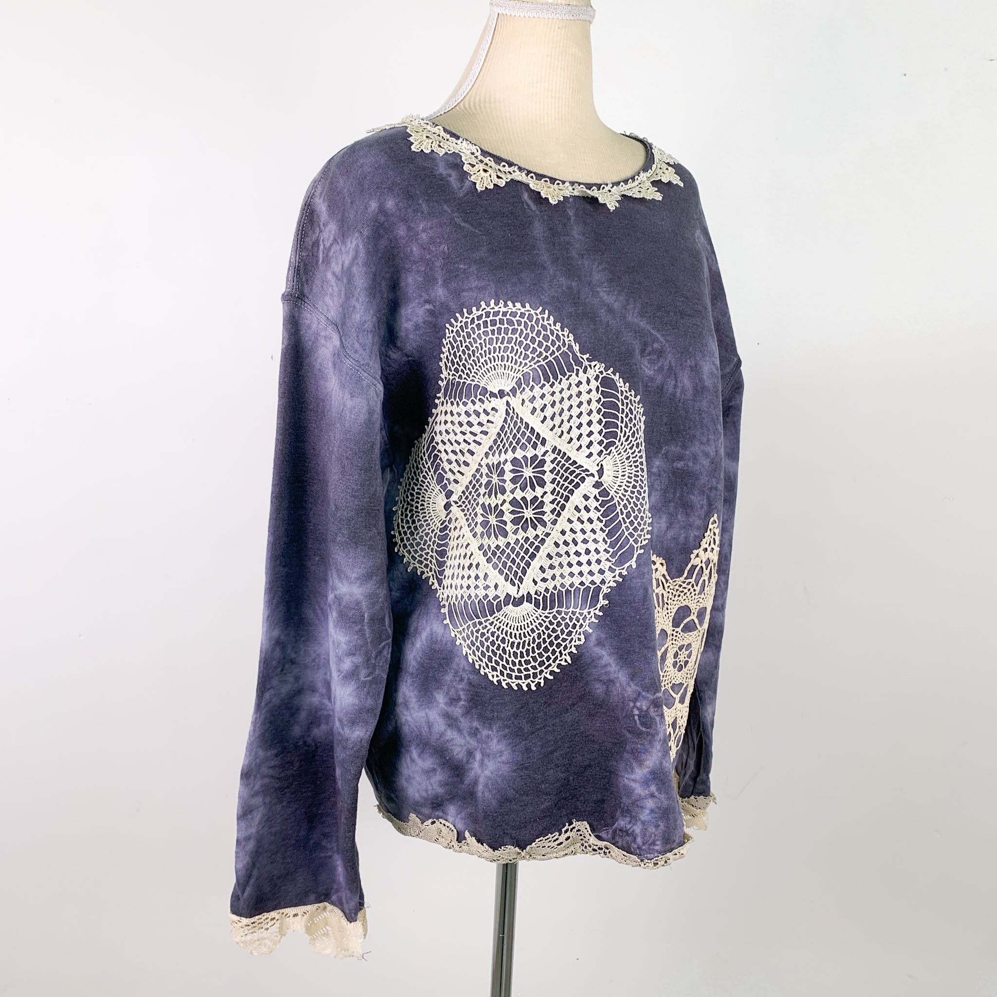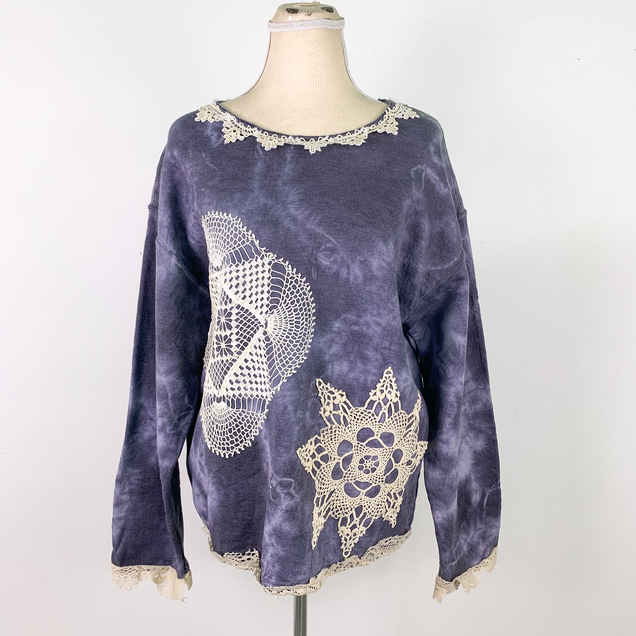 Upcycled Tie-Dye Sweatshirt With Lace Crochet Trim & Patches