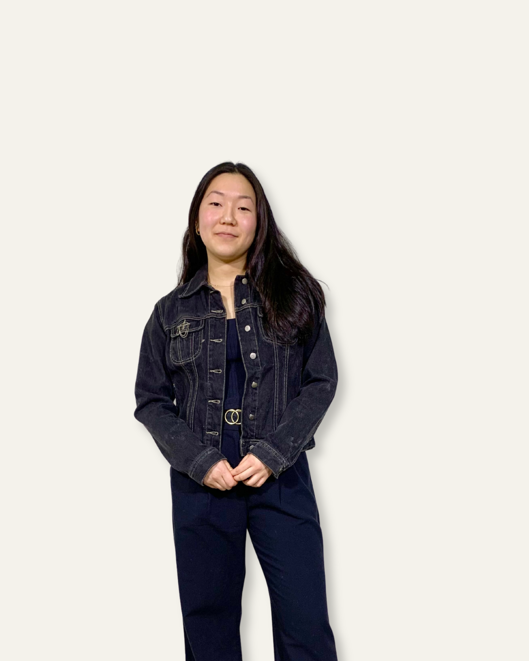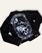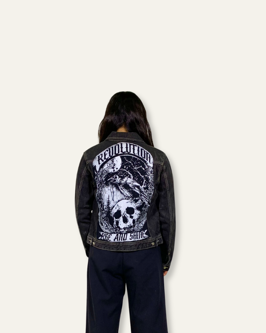 Upcycled Black Denim Jacket with Graphic Cutout On Back in size small, handmade at our Double Take Upcycling Studio.