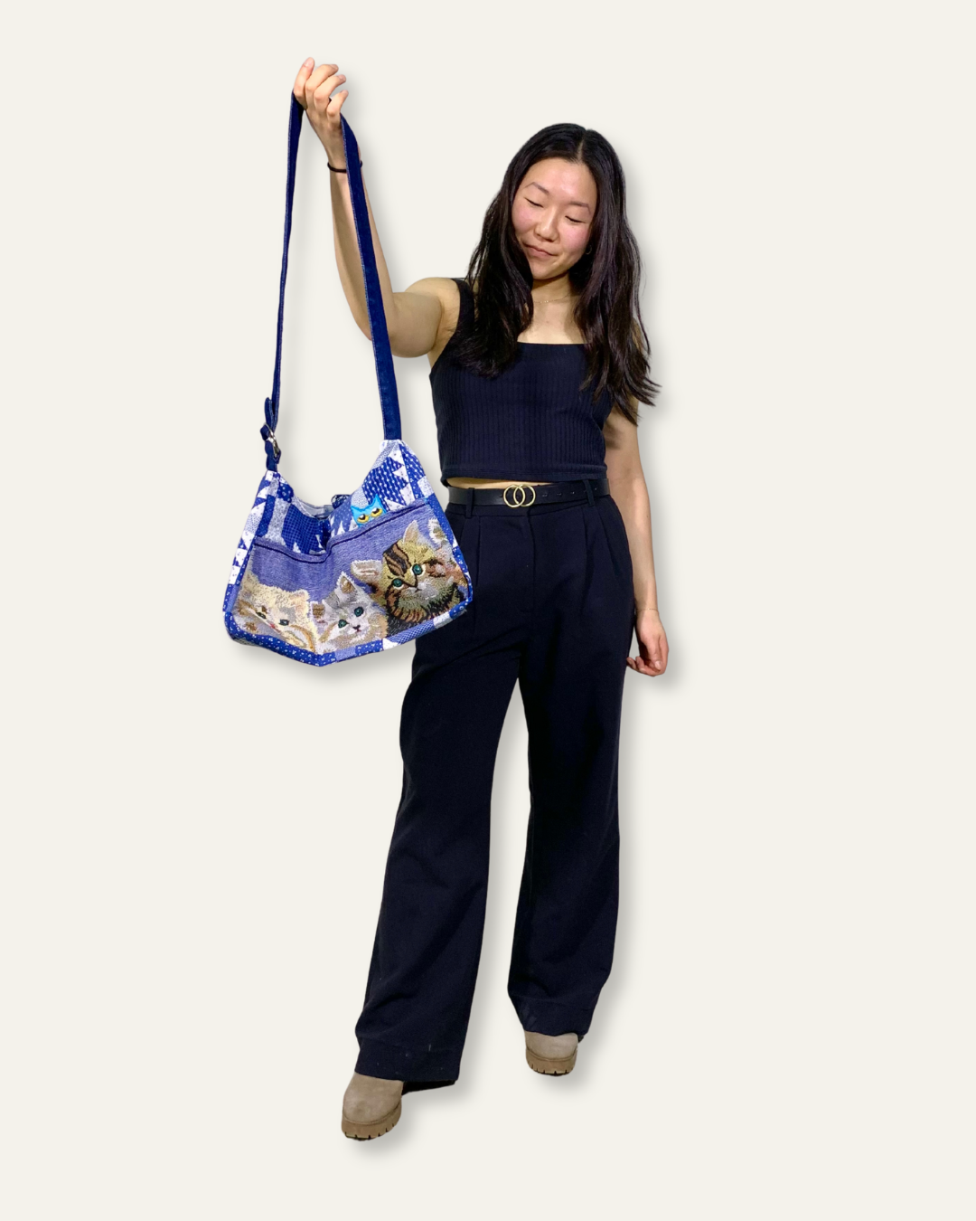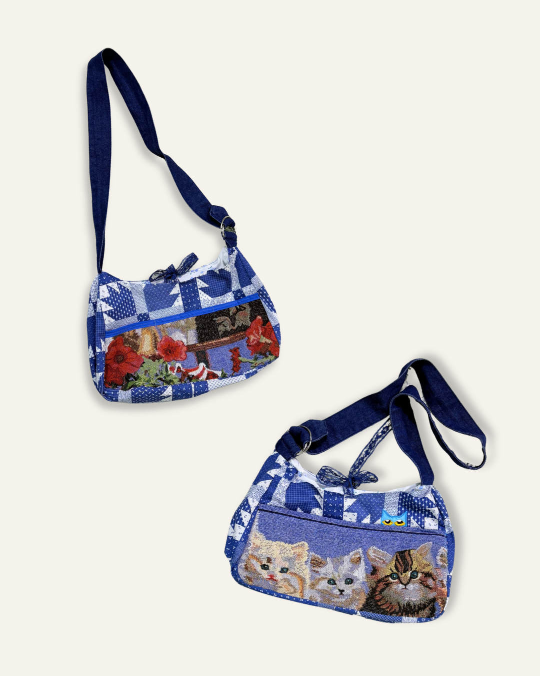 Upcycled Cat and Floral Design Bag handmade at our Double Take Upcycling Studio. Can be worn cross-body or over the shoulder. Features both exterior and interior pockets.