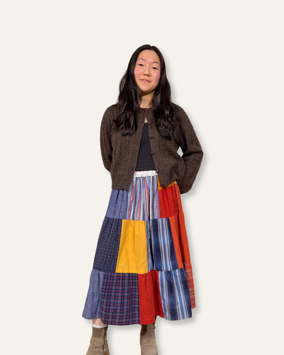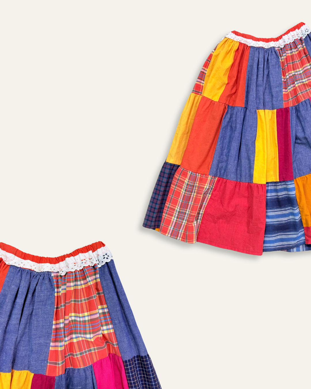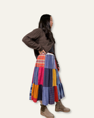 Upcycled Patchwork Tiered Maxi Skirt With Lace Trim Waistband