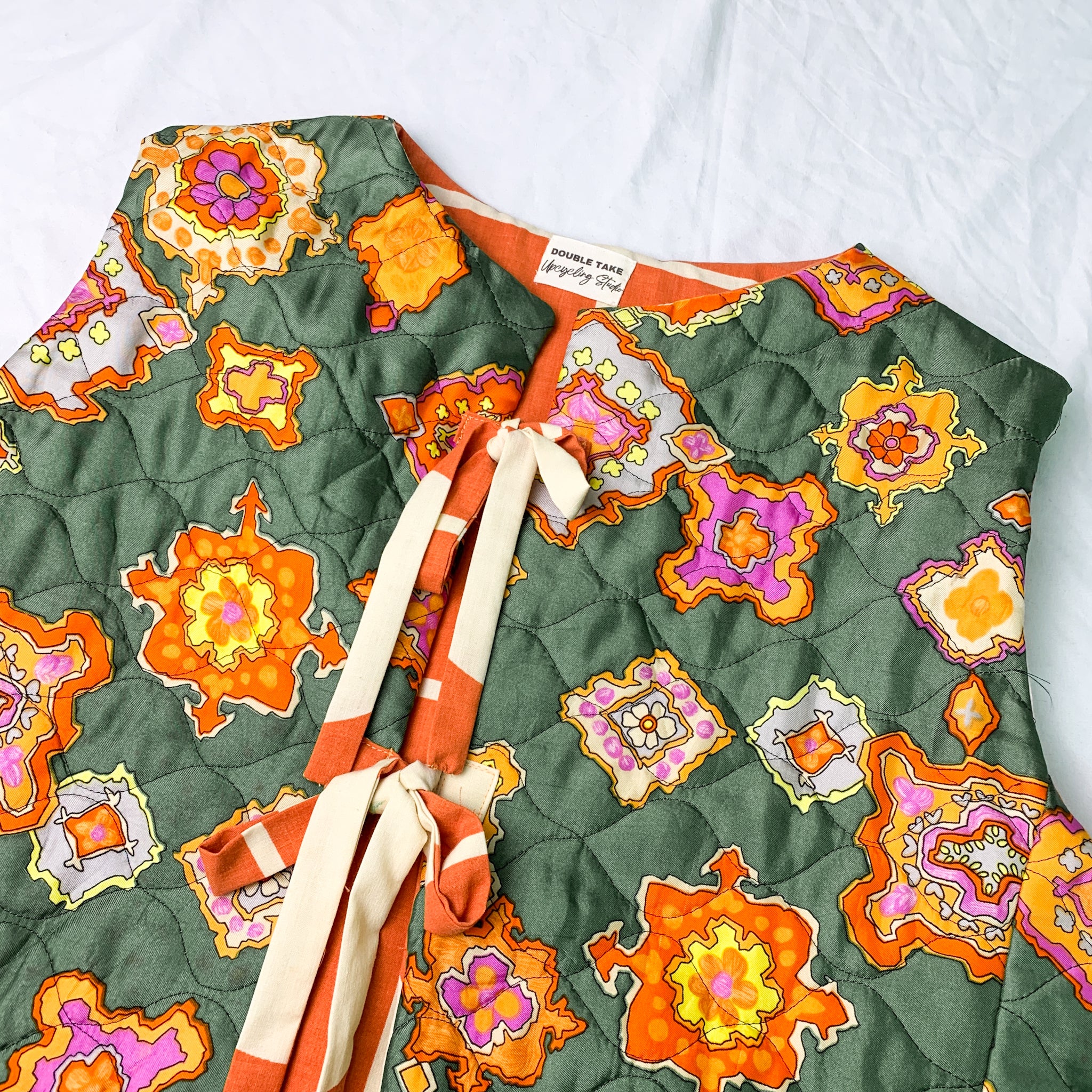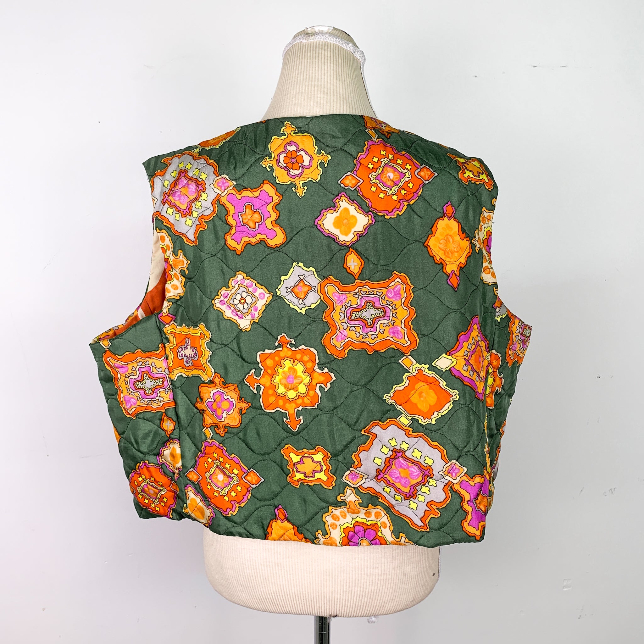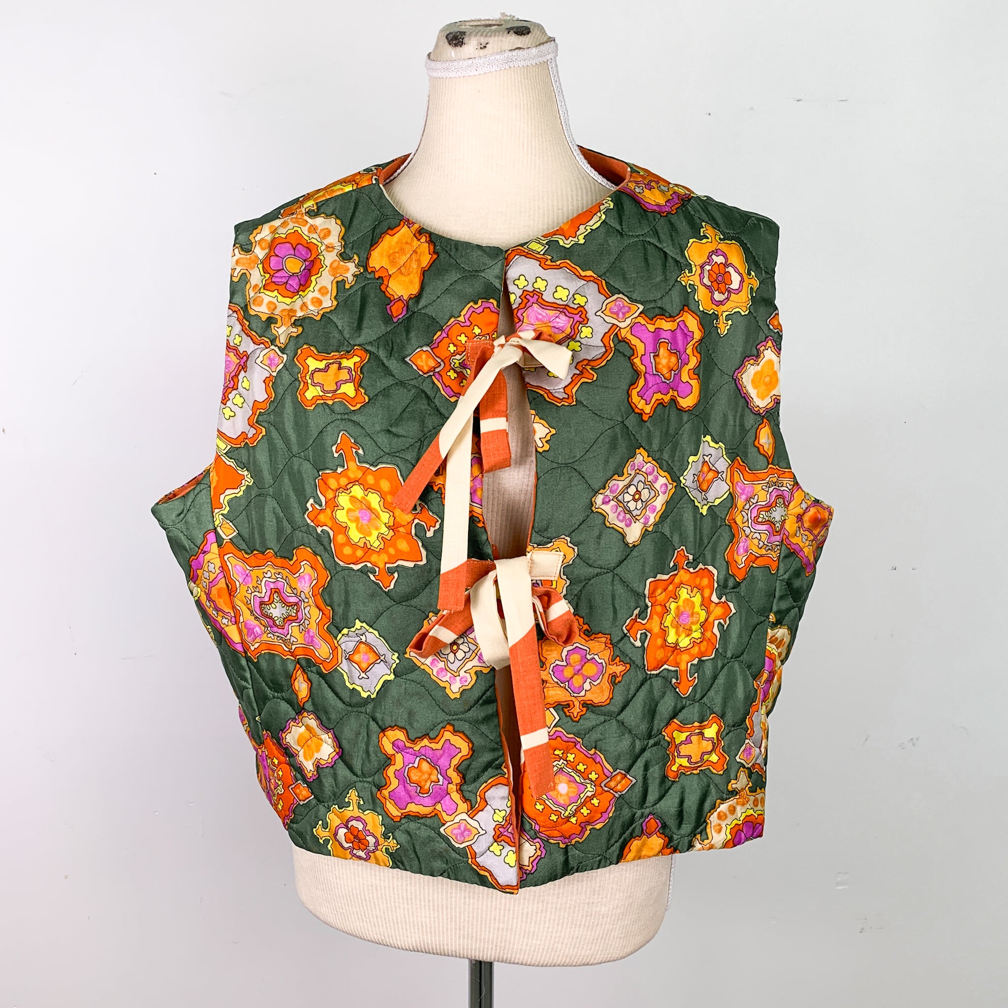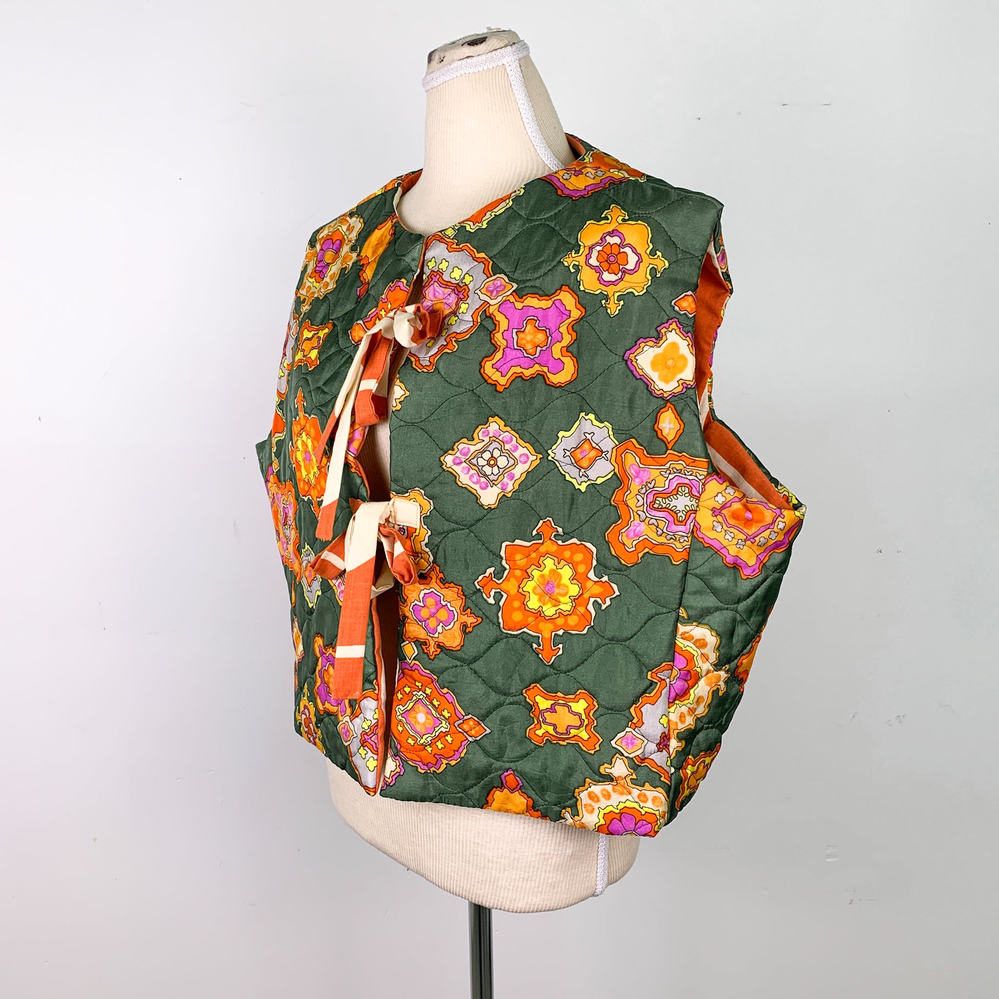 Upcycled Green/Orange Quilted Lined Tie-Up Vest
